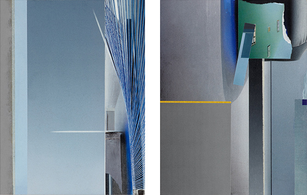 Etüden 9 und 10 – „In der Stadt I + II“, 2016, Acryl, Öl, Farbstift, Papier, Collagen auf Malplatten, je 24 x 18 cm