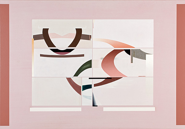Als wären da sechs, sieben Papiere zum zentralen Rechteckblock aufgeleimt, tritt das Querformat „Amor vincit omnia“ auf (Formula 76 - Amor vincit omnia). Alles natürlich Feinmalerei. Beherrscht wird jedes „Blatt“, das selbst nur Teil eines einst größeren Blattes scheint, vom wie abgeschnittenen Fragment eines exakten Streifens oder Kurvenschwungs. Die Fragmente wiederum sind so in Nachbarschaft gebracht, dass sie untereinander andocken, wenn auch mit markanten Brüchen bezüglich Farbe oder Richtung. Neben Grüntönen bestimmen das Gemälde Rosig-, Zimt- und Brauntöne – sämtlich Weiß-Abmischungen. Töne, die sich auch im Umfeld der Blätter-Formation wiederfinden, sowie in den beiden Vertikalbalken, die das Ganze am linken und rechten Rand verklammern. Absolute Ausgewogenheit, ohne doch zu Tode stillgestellt zu sein, ist offenkundigste Qualität des Endergebnisses.